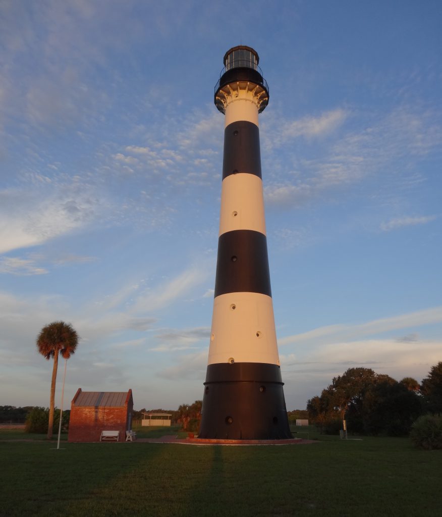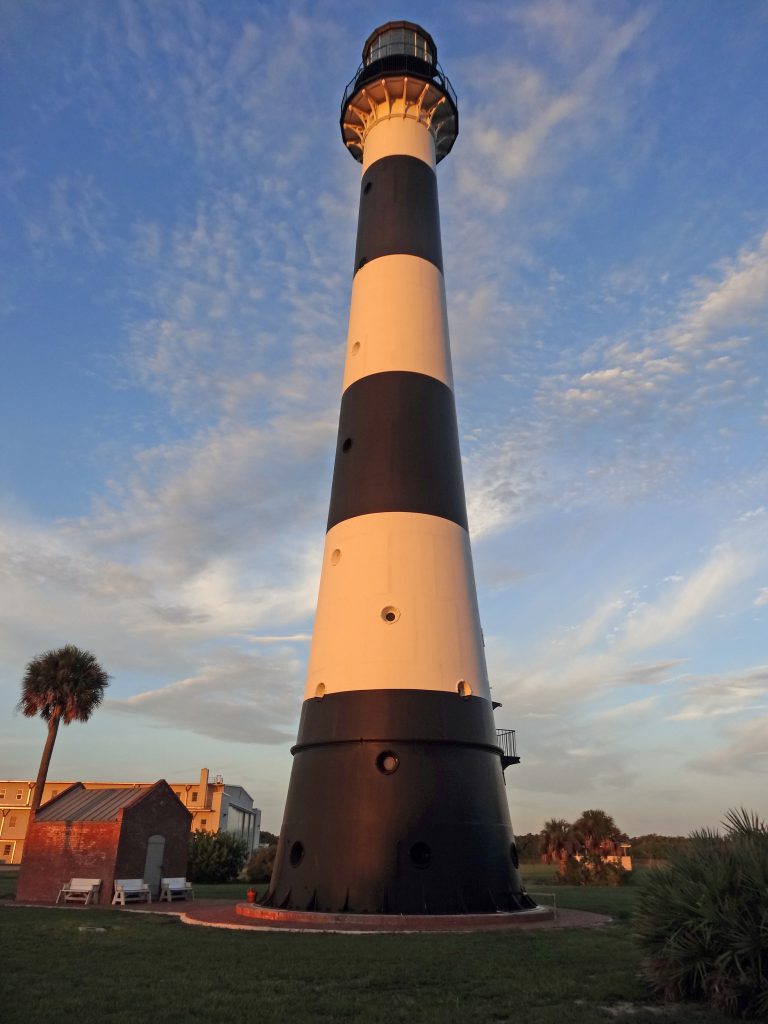 The Cape Canaveral Lighthouse is the oldest standing structure on the Cape. Originally built in 1868 to replace a much shorter brick lighthouse, it was moved to its present location and put back into service in 1894.